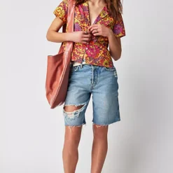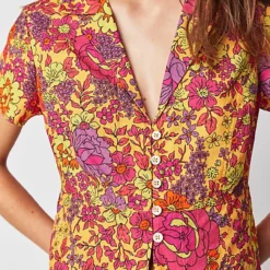 A new take on the timeless vacation shirt. this vintage-inspired piece is featured in a classic. slightly cropped fit with defined bottom hem for an added sweet touch.